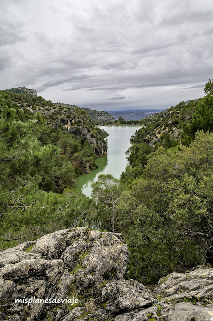 Después de estar un rato fotografiando y disfrutando la magnificencia del agua del arroyo de Aguascebas en su caída, decidimos seguir un poco la ruta, a unos 100 metros de la cascada encontramos una pequeña explanada en la que nos adentramos y cruzamos un pequeño arroyo. Encontramos una ladera repleta de roca de color gris que nos llamó la atención y decidimos subir un poco, no era una subida de gran dificultad, porque la roca parecía haber diseñado unos escalones naturales. La subida mereció la pena, porque desde la parte de arriba hay una impresionante vista de la cascada a lo lejos, y cambiando un poco de posición se observa también una magnífica vista del pantano de Aguascebas.
